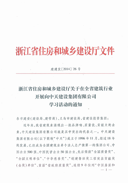 《浙江省住房和城乡建设厅关于在全省建筑行业开展向俄罗斯专享会294建设集团有限公司学习活动的通知》